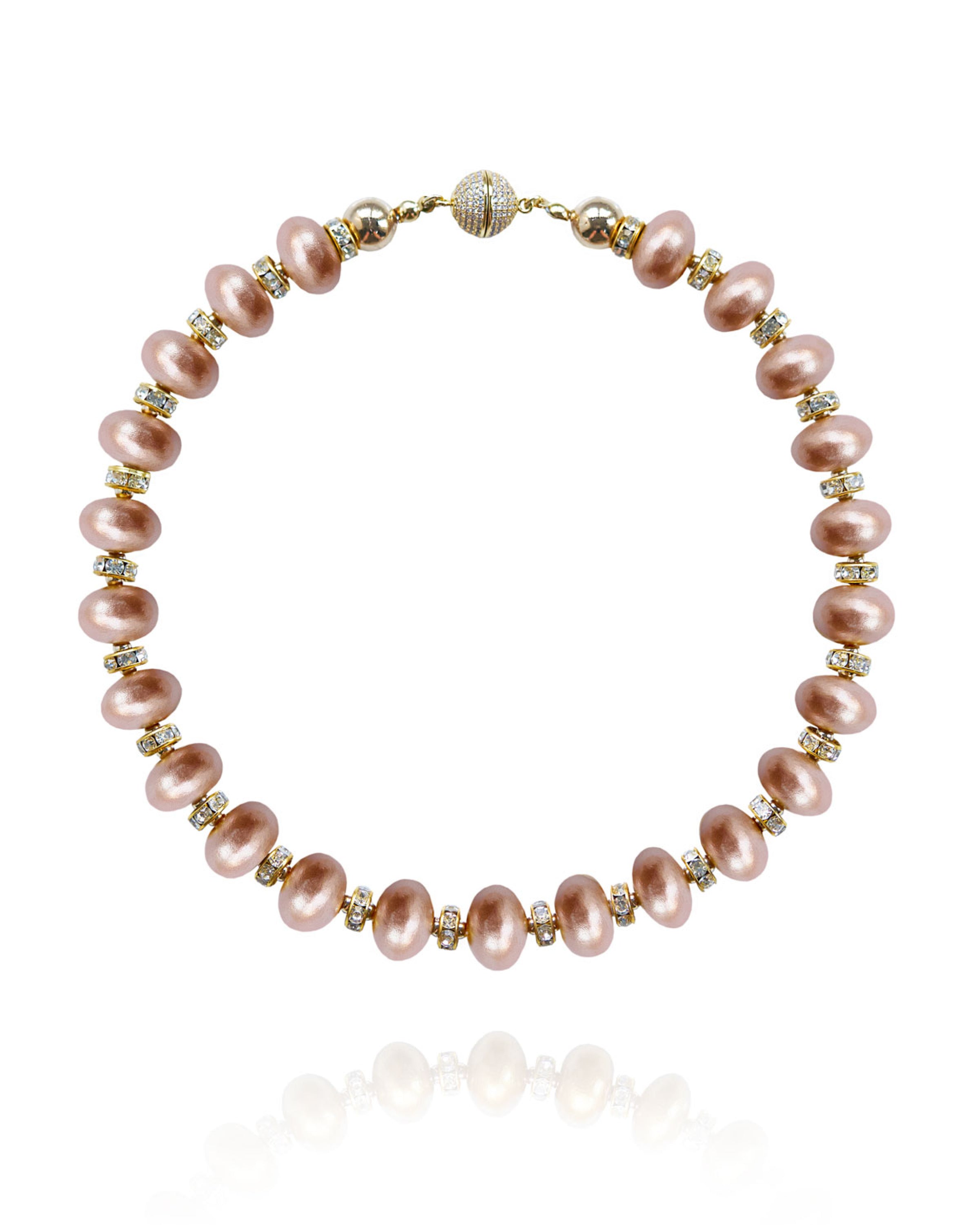 Allow your neckline to do the talking. Mika Necklace is an elegant balance of metallic sparkle and hand-painted luster. Her string of oval-shaped wooden beads is punctuated by Preciosa® Crystal Rondelles in between, and her weight feels like glamorous armor. Even her clasp exudes effortless sophistication—a magnetic, 18K gold-plated brass closure with sparkling cubic zirconias. If you’re searching for that show-stopping look, Mika Necklace can be mixed and matched with the Mika Bracelet and several earrings from the La Dolce Vita Collection.