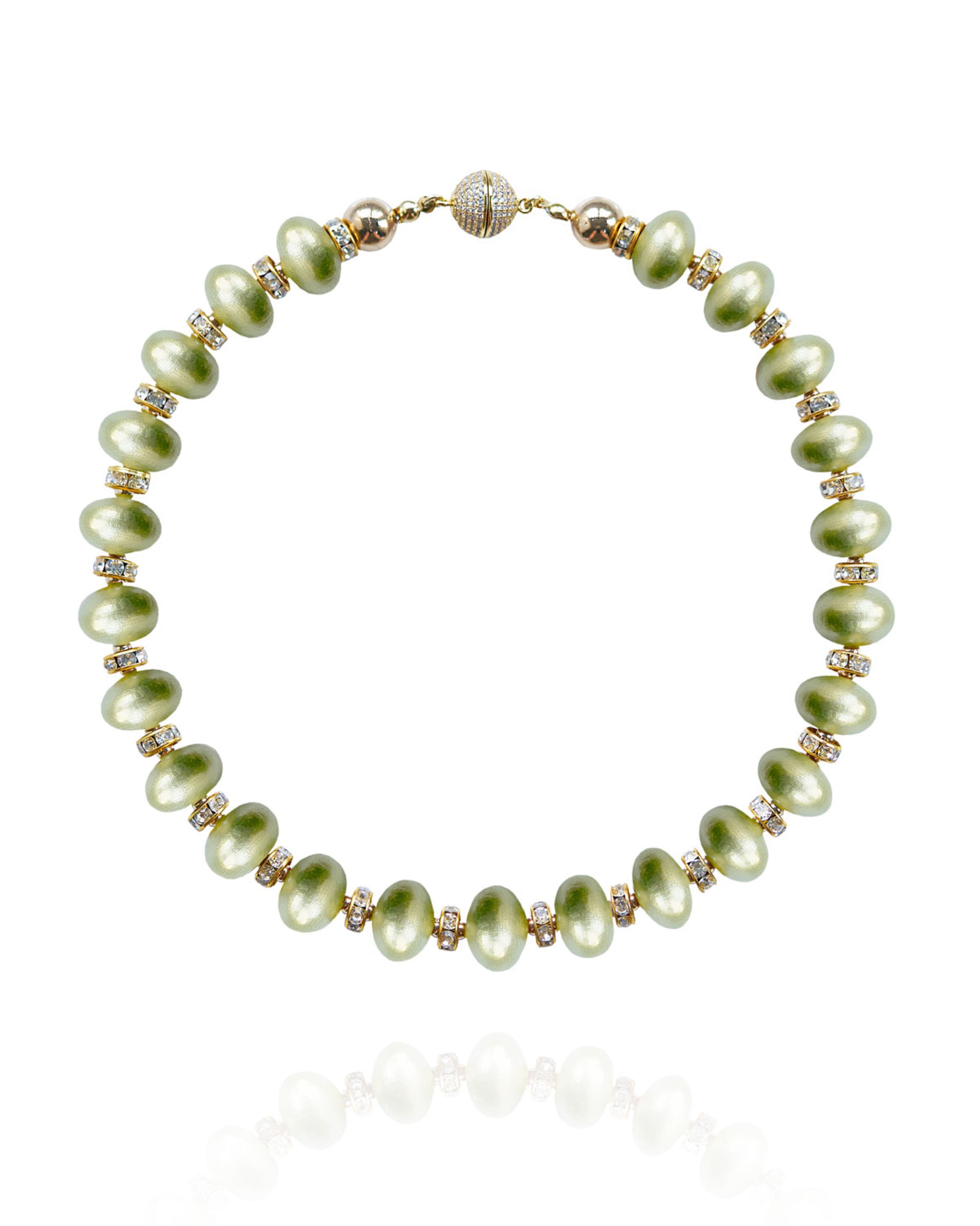 Allow your neckline to do the talking. Mika Necklace is an elegant balance of metallic sparkle and hand-painted luster. Her string of oval-shaped wooden beads is punctuated by Preciosa® Crystal Rondelles in between, and her weight feels like glamorous armor. Even her clasp exudes effortless sophistication—a magnetic, 18K gold- or silver-plated brass closure with sparkling cubic zirconias. If you’re searching for that show-stopping look, Mika Necklace can be mixed and matched with the Mika Bracelet and several earrings from the La Dolce Vita Collection.