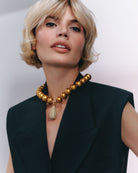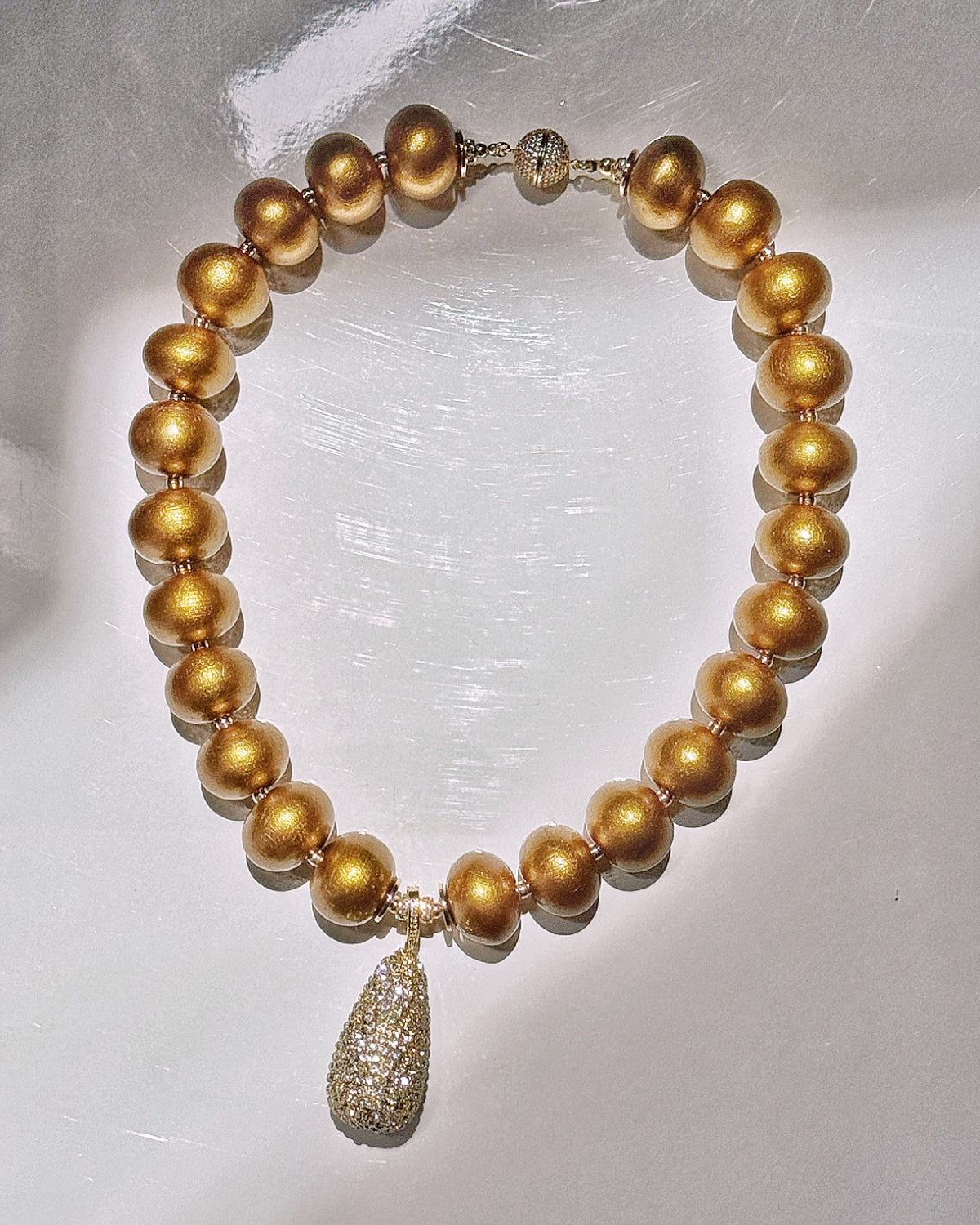 Behold a modern heirloom of timeless beauty. The Serafina Necklace is enrapturing elegance, with a string of hand-painted wooden beads in rich metallic tones. At the center sits a crystal rhinestone pendant. The necklace features dual magnetic silver-plated brass closures with sparkling cubic zirconias, along with a decorative bead in between that acts as an extender, allowing it to be worn at two different lengths. You can also remove the pendant for a more streamlined look.