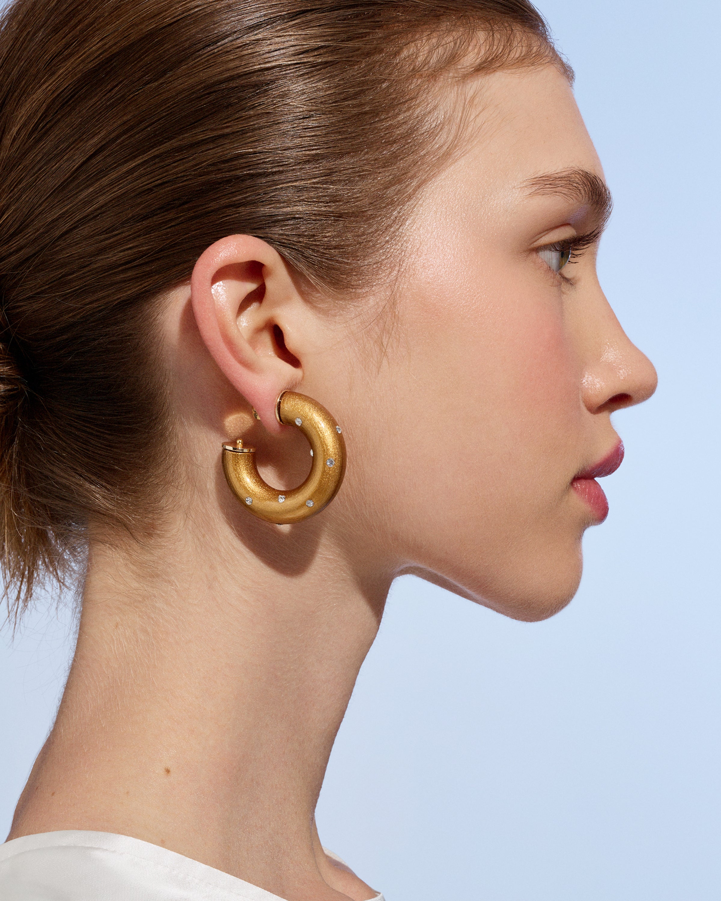 Glossy. Sculptural. Surprisingly lightweight. The Alba Hoops are bold statement earrings with a smooth, rounded silhouette, a high-shine finish, and shimmering Austrian crystals that add a sharp, unexpected edge. They elevate everything, never weigh you down, and bring just enough bite to keep things interesting. Minimal effort. Maximum presence.