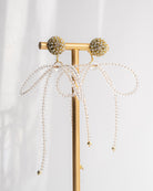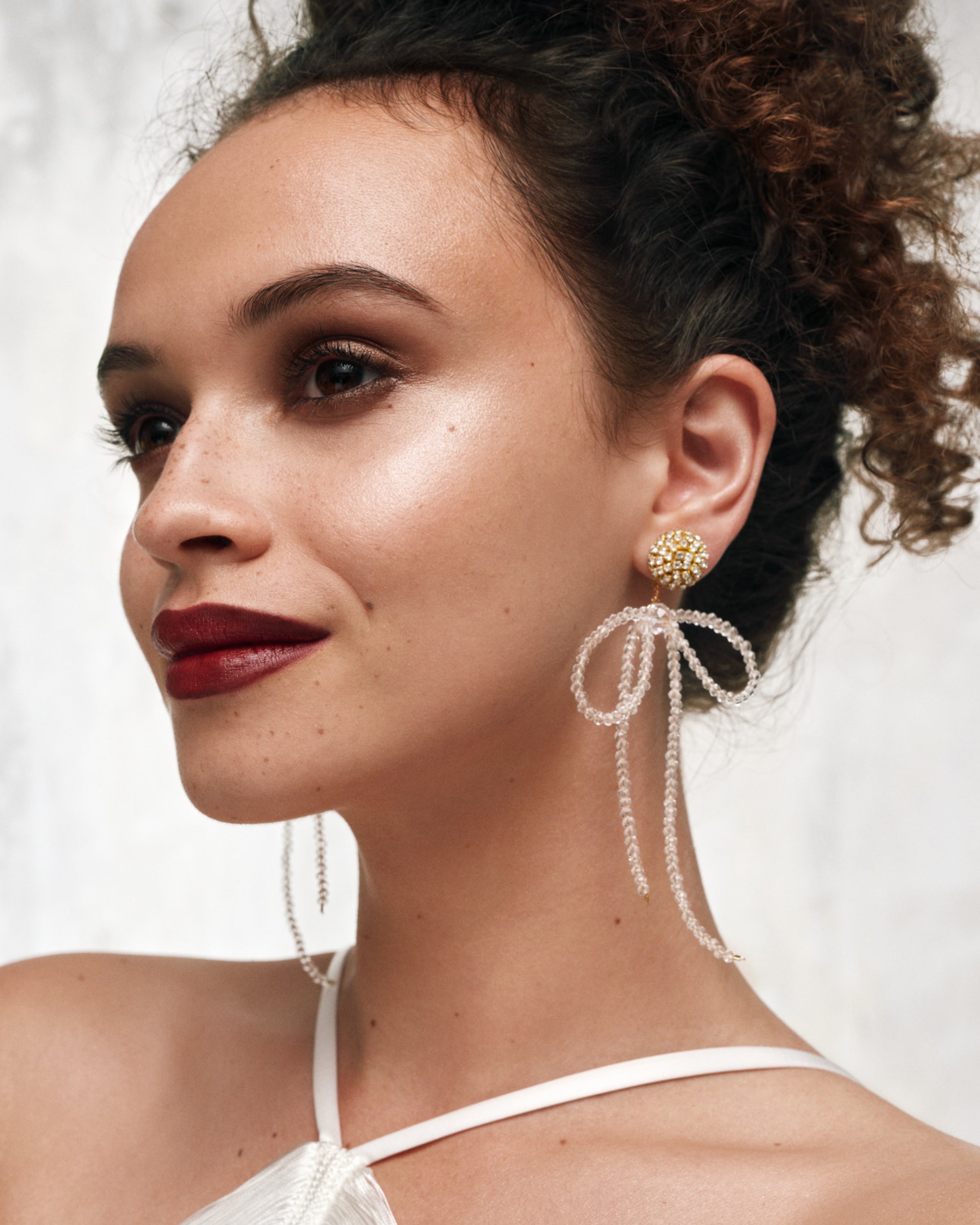 Interested in something a touch more unexpected? Lucia Earrings are a modern spin on a feminine classic—the bow. Tiny glass beads are strung tightly together and fashioned into a loose, flowing bow. In its center sits a statement bead, which hangs from a show-stopping rhinestone stud that bursts forth like a firework. You’ll have a hard time choosing from a handful of staple colors, but have no problem working Lucia Earrings into every occasion wear. She’s the perfect playful wink.