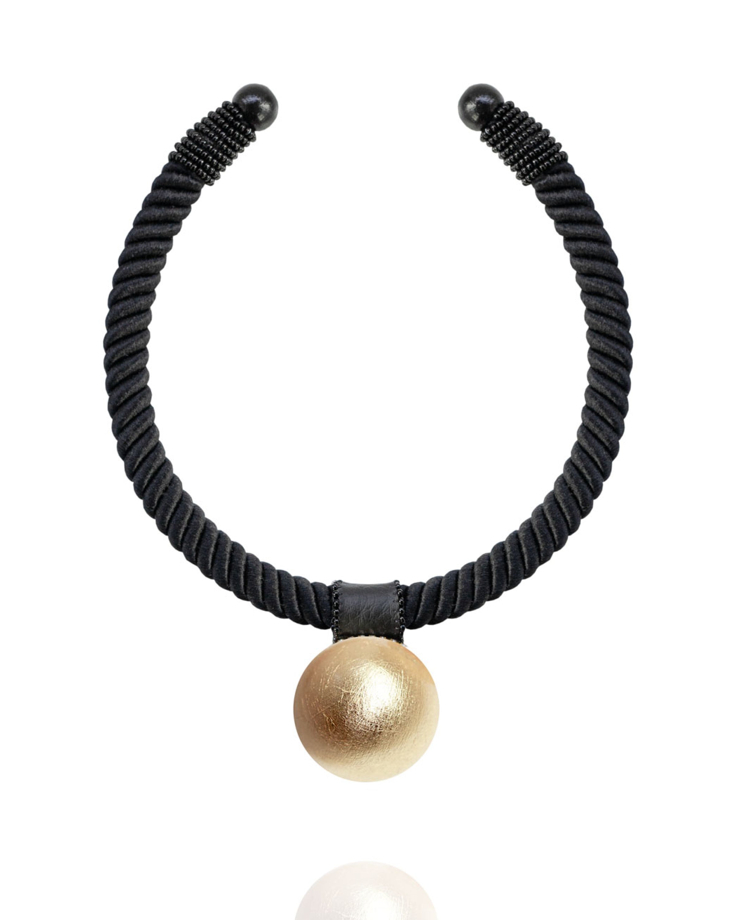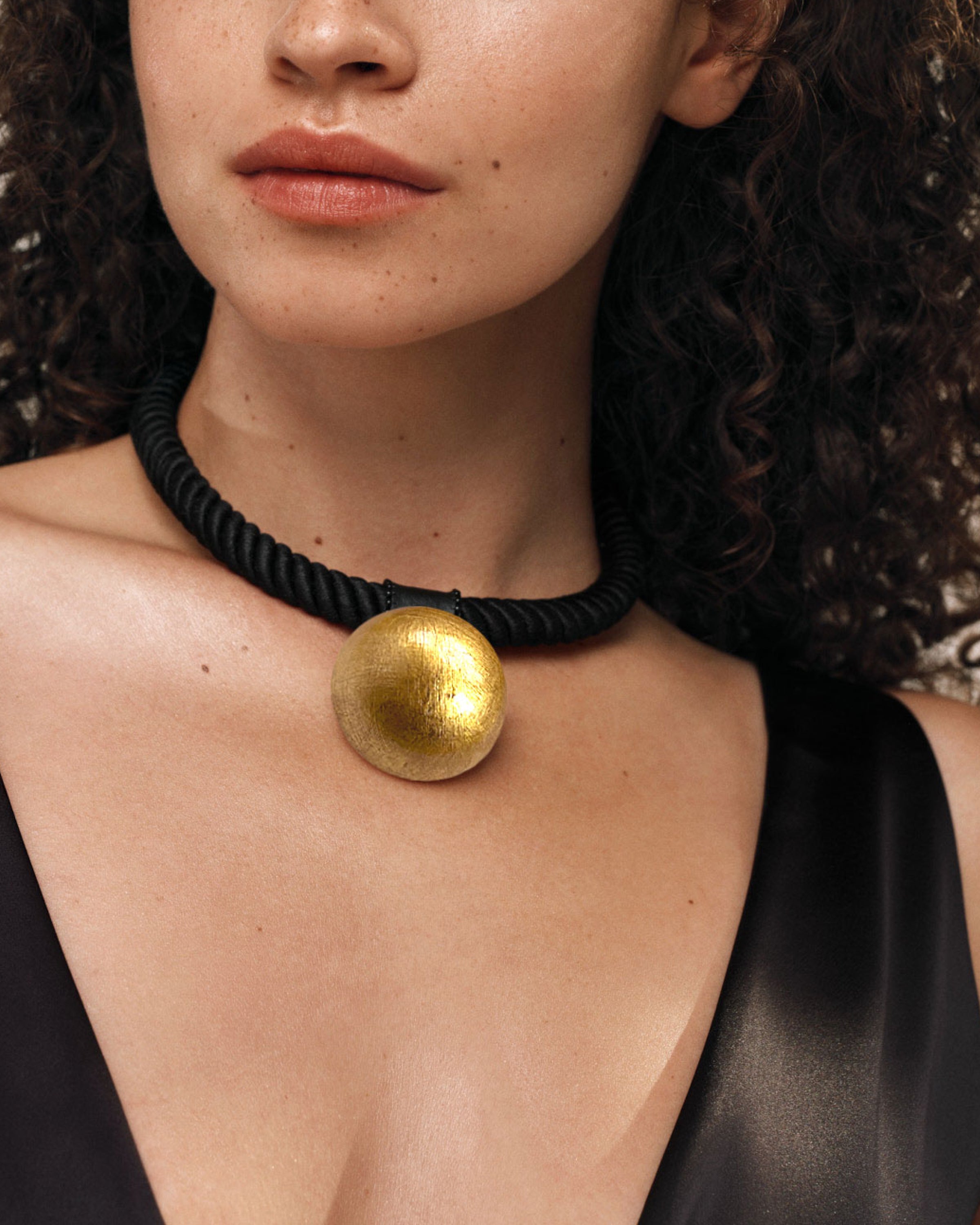 Lovers of sparkle will go starry eyed for the Gaia Glam Necklace. We took the spherical, statement-making power of our Gaia Earrings, dressed it in dazzling rhinestones, and affixed it as a pendant to a rope-wrapped choker cuff. The result is both opulent and texturally dynamic. Choose from a silver or gold centerpiece and allow the Gaia Glam Necklace to bring the essence of life to every outfit—much like her namesake, the Greek goddess Gaia, who mothered earth and all life upon it.
