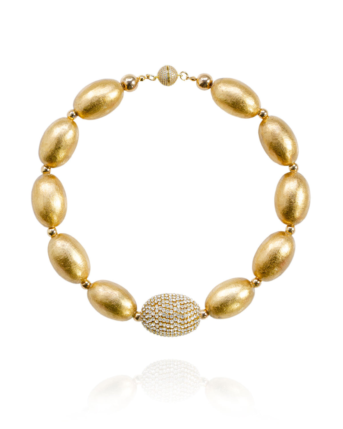 A flash of glam for your neckline. The Chérie Necklace features a rhinestone statement bead, gold- or silver-foiled wood beads, and alternating hematite for earthy contrast and shine. Its choker length sits just right, finished with an ornamental clasp. Whether over a chunky sweater or paired with a sleek dress, Chérie brings classic glamour to every occasion.