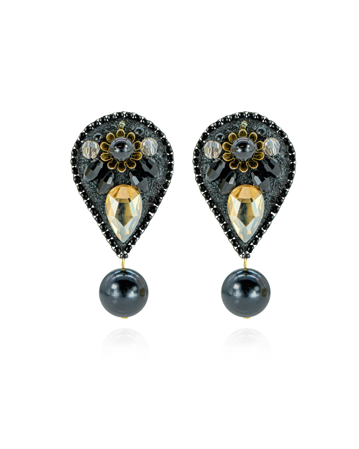 The glamorous Chloë Earrings deliver art deco detail in spades. Austrian crystals and glass pearls create a geometric sunburst motif in a rich palette of gold tones. Her upside-down teardrop shape is punctuated by a dangling bead that sways confidently alongside you. The Chloë Earrings are practically begging you to dress up, darling.