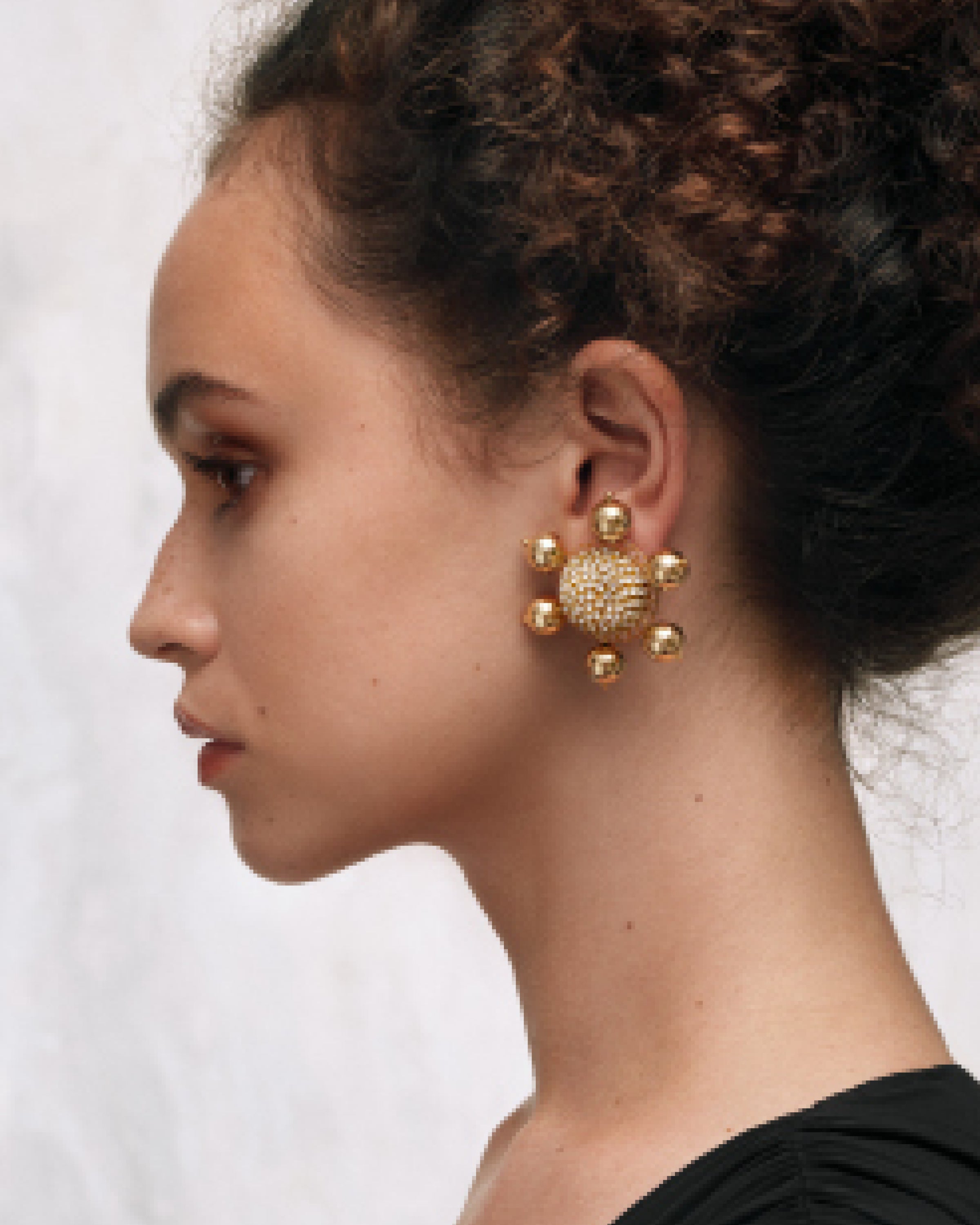 Radiate classic glamor with the Jolie Earrings. A sparkly rhinestone center is punctuated by beaded rays for a Saulė spin on the starburst style. Jolie Earrings are for the women willing to be loud and lavish, who never shy from a statement-maker. Just clip on, step out and shine bright—and shop the sister pieces of this collection, the Jolie Necklace, the Jolie Lapel Pin and Jolie Barrettes.