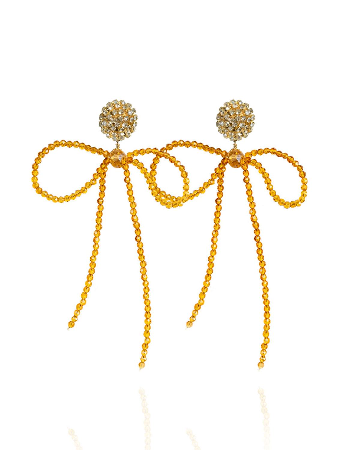 Interested in something a touch more unexpected? Lucia Earrings are a modern spin on a feminine classic—the bow. Tiny glass beads are strung tightly together and fashioned into a loose, flowing bow. In its center sits a statement bead, which hangs from a show-stopping rhinestone stud that bursts forth like a firework. You’ll have a hard time choosing from a handful of staple colors, but have no problem working Lucia Earrings into every occasion wear. She’s the perfect playful wink.