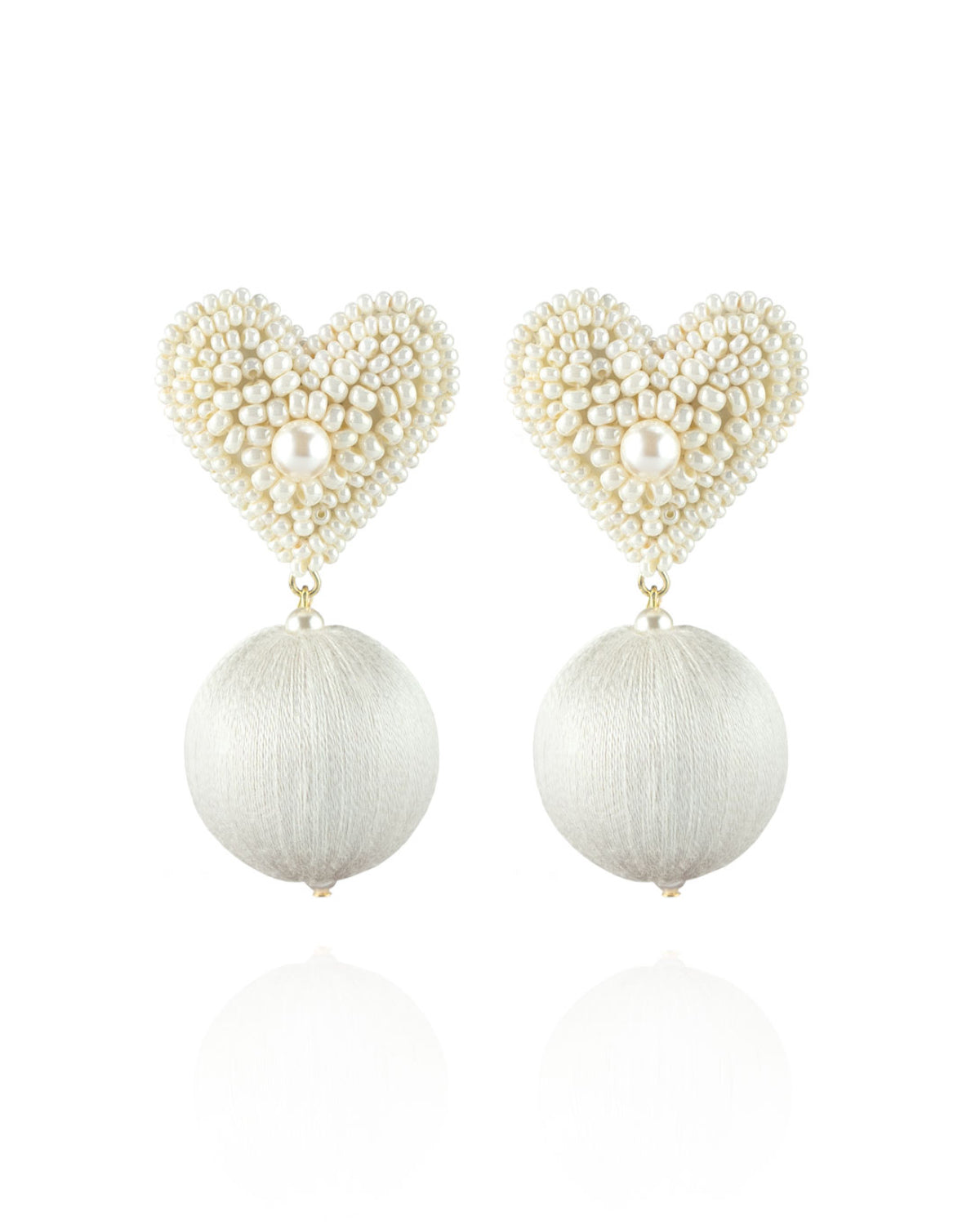Luisa Earrings make romance exclamatory. Handcrafted with pineapple leather and glass beading from vintage gowns, to form a glimmering heart shape punctuated by a complementary sphere of color.