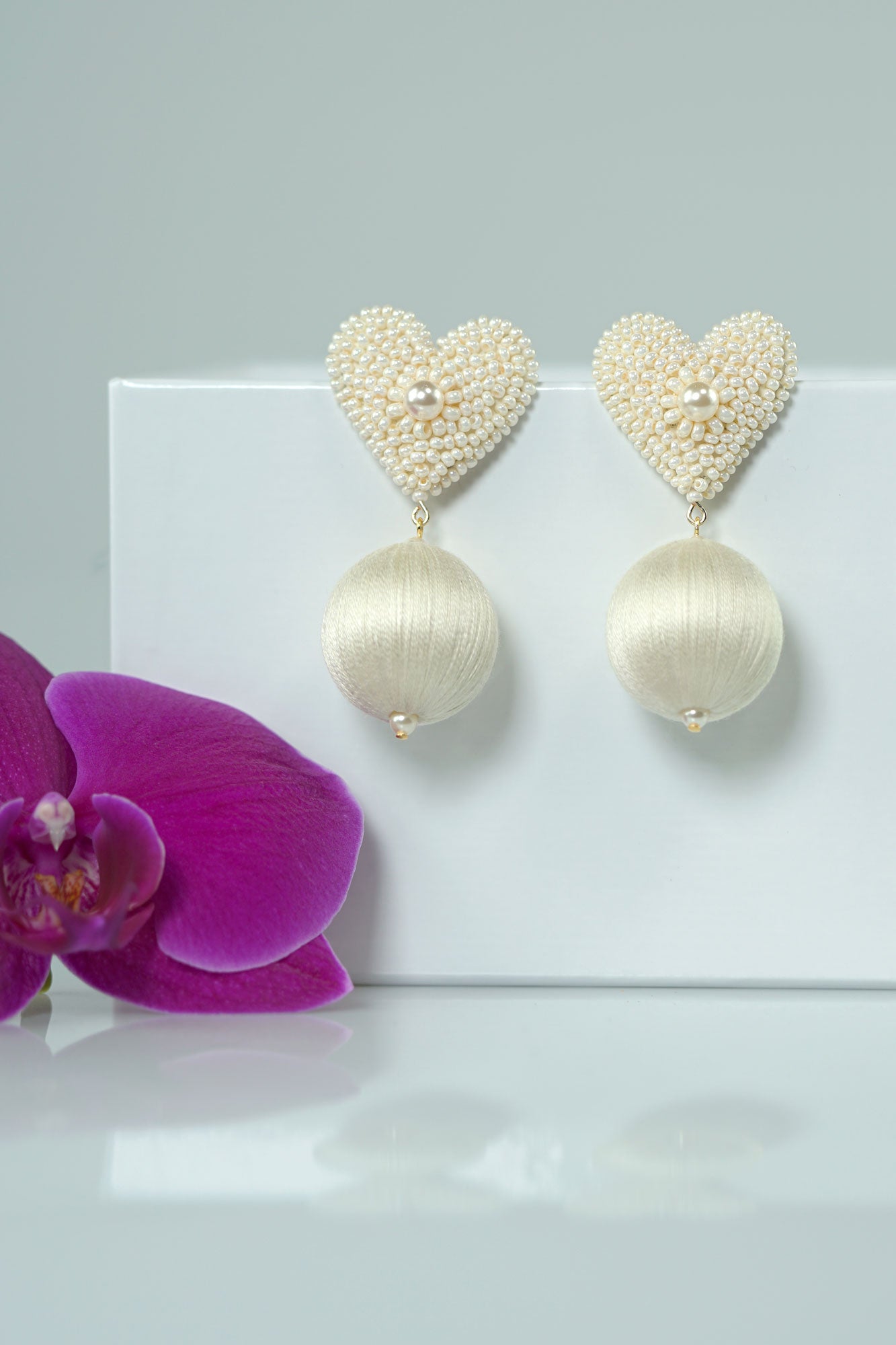 Austrian Glass Pearls, Glass Beads, French Cotton Thread, Pinatex® Base and Backing - leather made from pineapple leaves, Wood Base, 18K Gold Plated Brass Posts / Nickel Free