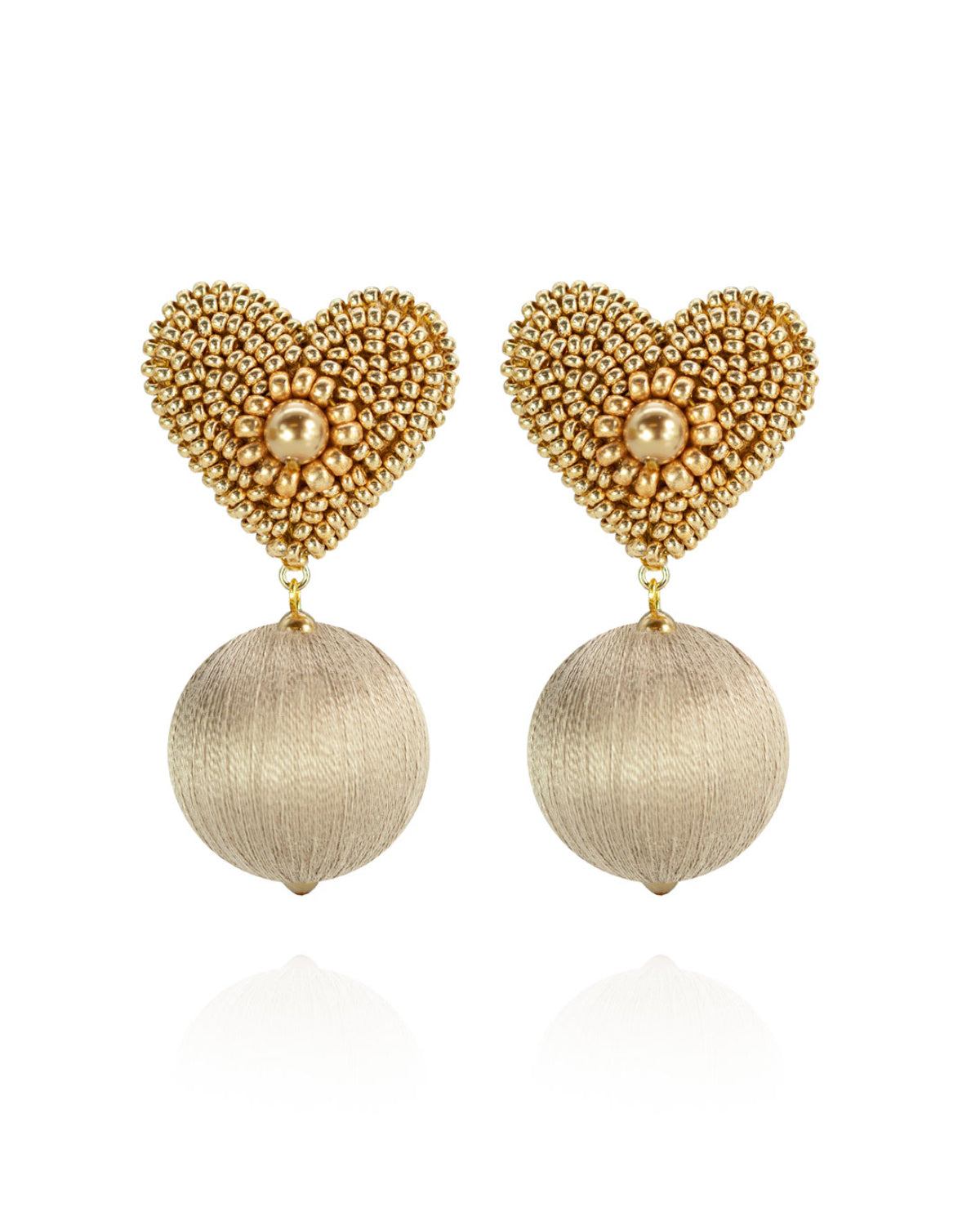 Luisa Earrings make romance exclamatory. Handcrafted with pineapple leather and glass beading from vintage gowns, to form a glimmering heart shape punctuated by a complementary sphere of color.