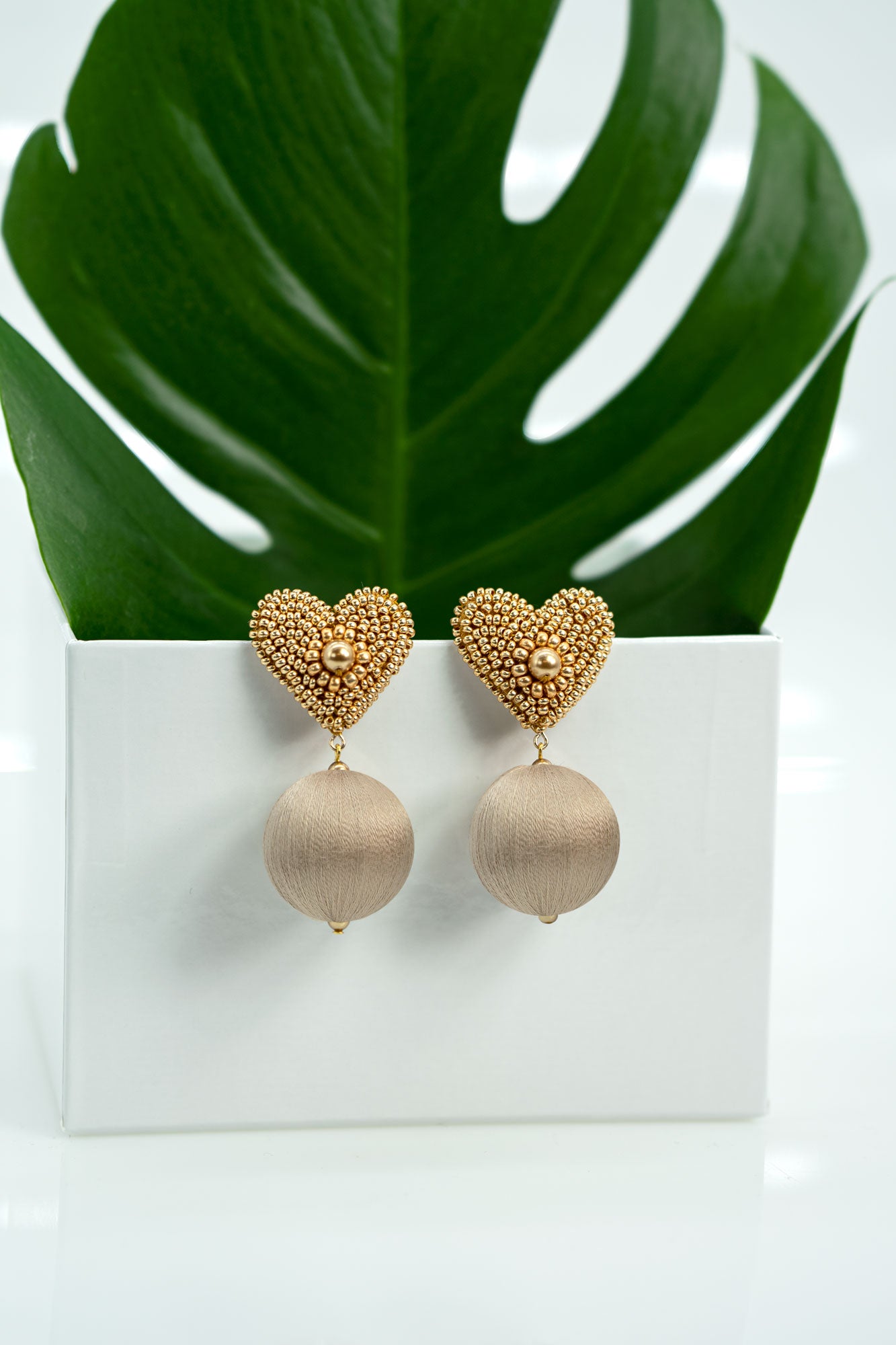 Austrian Glass Pearls, Glass Beads, French Cotton Thread, Pinatex® Base and Backing - leather made from pineapple leaves, Wood Base, 18K Gold Plated Brass Posts / Nickel Free