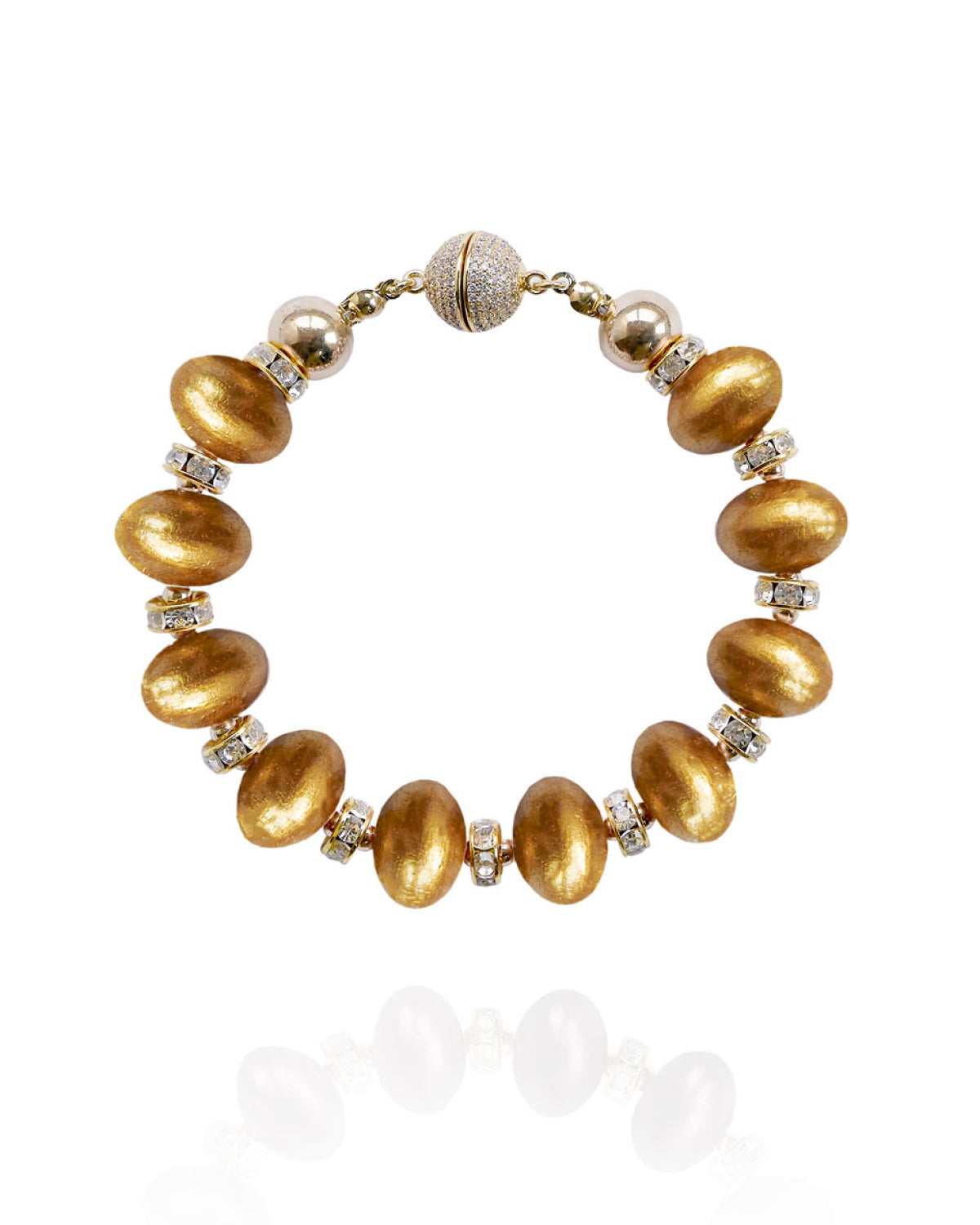 You’ll never stop reaching for our exquisite Mika Bracelet, and admiring her elegant balance of metallic sparkle and hand-painted luster. A string of oval-shaped wooden beads is punctuated by Crystal Rondelles in between, accentuating the wrist while showing off your eye for feminine detail. Even Mika’s clasp exudes effortless sophistication—a magnetic, 18K gold-plated brass closure with sparkling cubic zirconias. Love to coordinate accessories? We sure do. Mika Bracelet is designed to pair with our Mika Necklace, and several earrings from the La Dolce Vita Collection.
