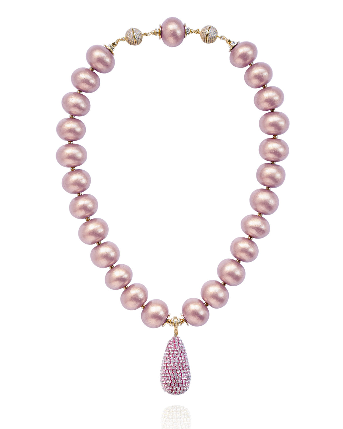 Behold a modern heirloom of timeless beauty. The Serafina Necklace is enrapturing elegance, with a string of hand-painted wooden beads in rich metallic tones. At the center sits a crystal rhinestone pendant. The necklace features dual magnetic silver-plated brass closures with sparkling cubic zirconias, along with a decorative bead in between that acts as an extender, allowing it to be worn at two different lengths. You can also remove the pendant for a more streamlined look.