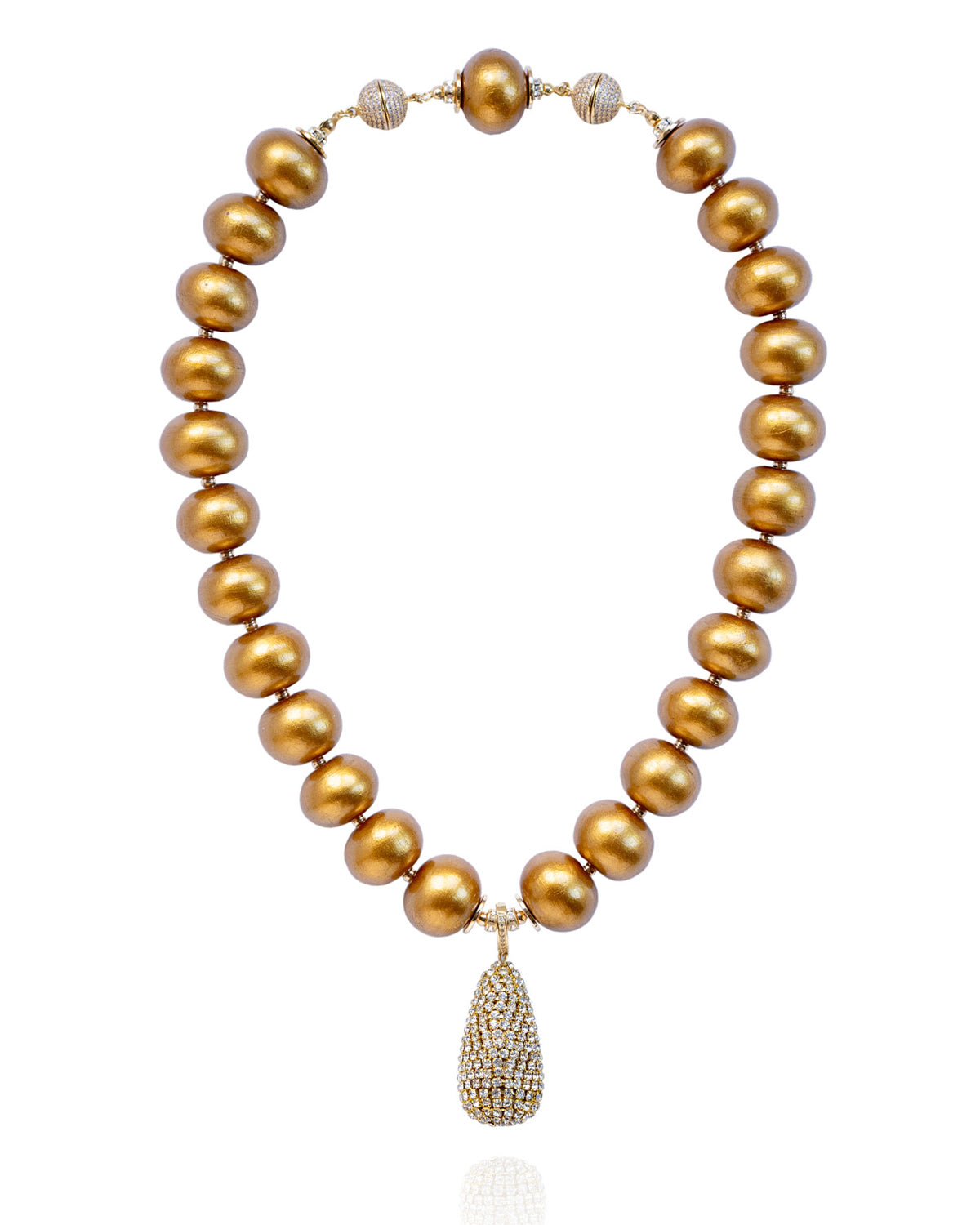 Behold a modern heirloom of timeless beauty. The Serafina Necklace is enrapturing elegance, with a string of hand-painted wooden beads in rich metallic tones. At the center sits a crystal rhinestone pendant. The necklace features dual magnetic silver-plated brass closures with sparkling cubic zirconias, along with a decorative bead in between that acts as an extender, allowing it to be worn at two different lengths. You can also remove the pendant for a more streamlined look.