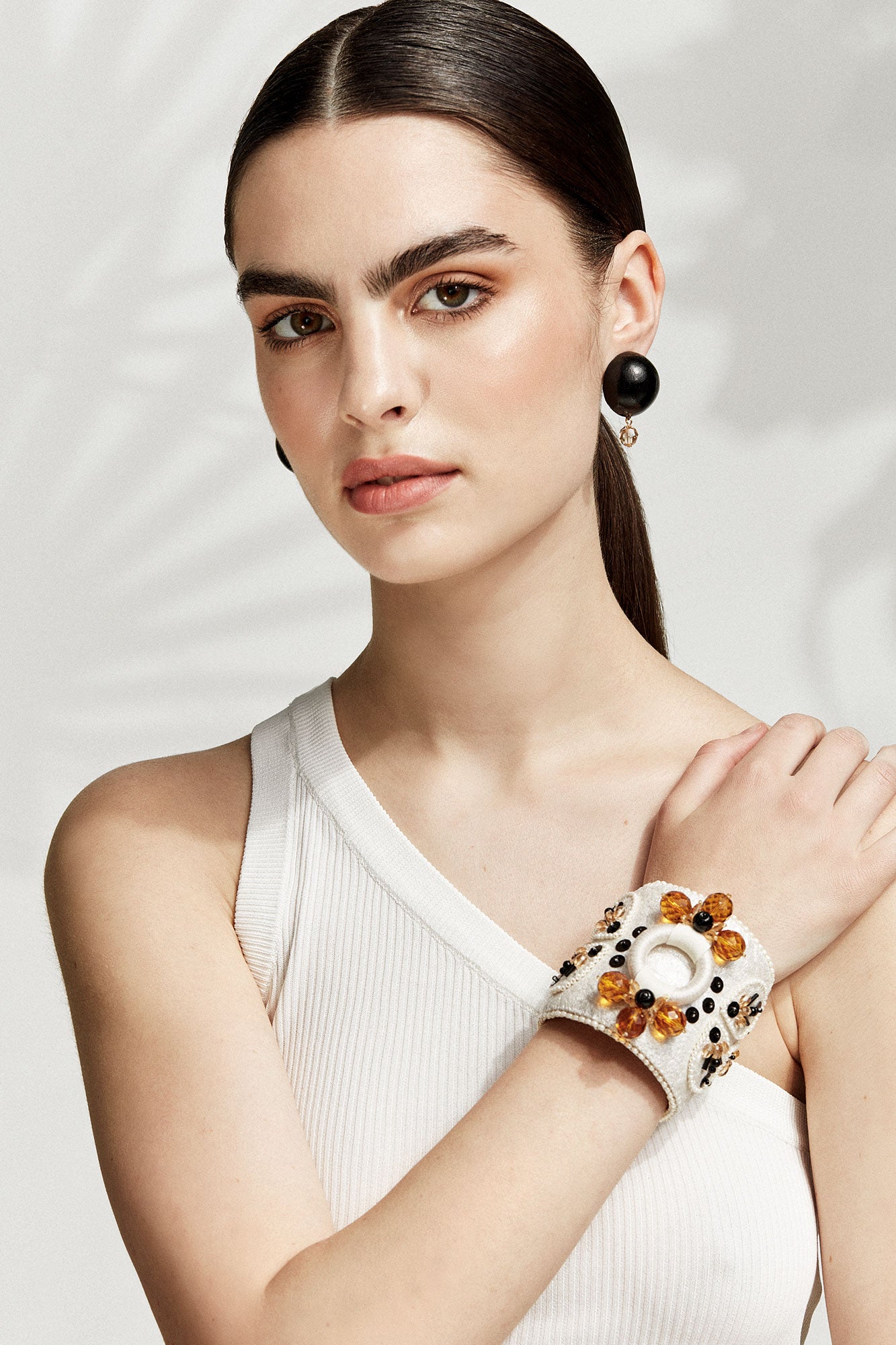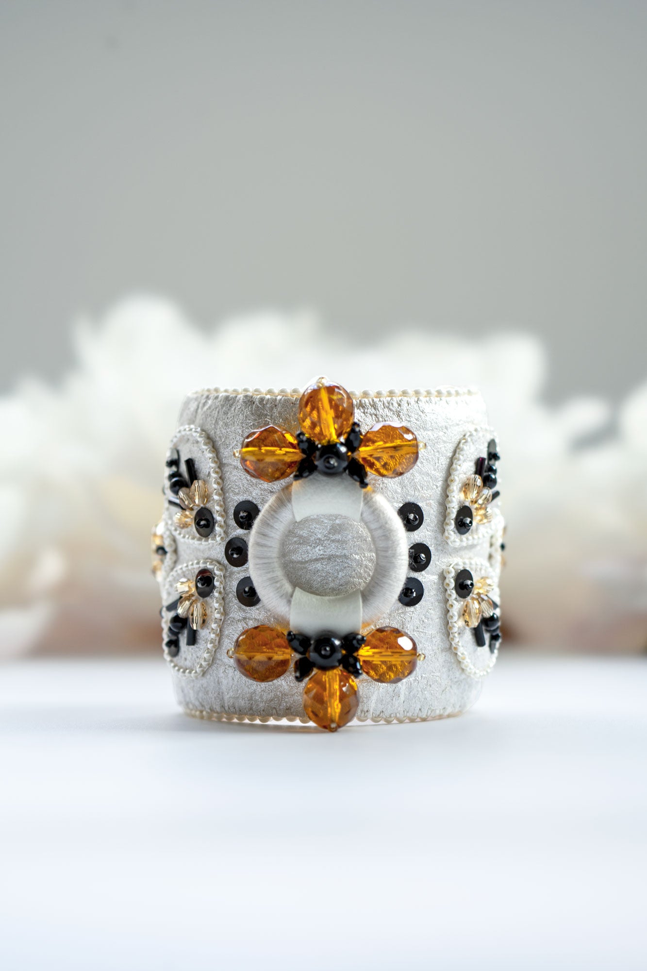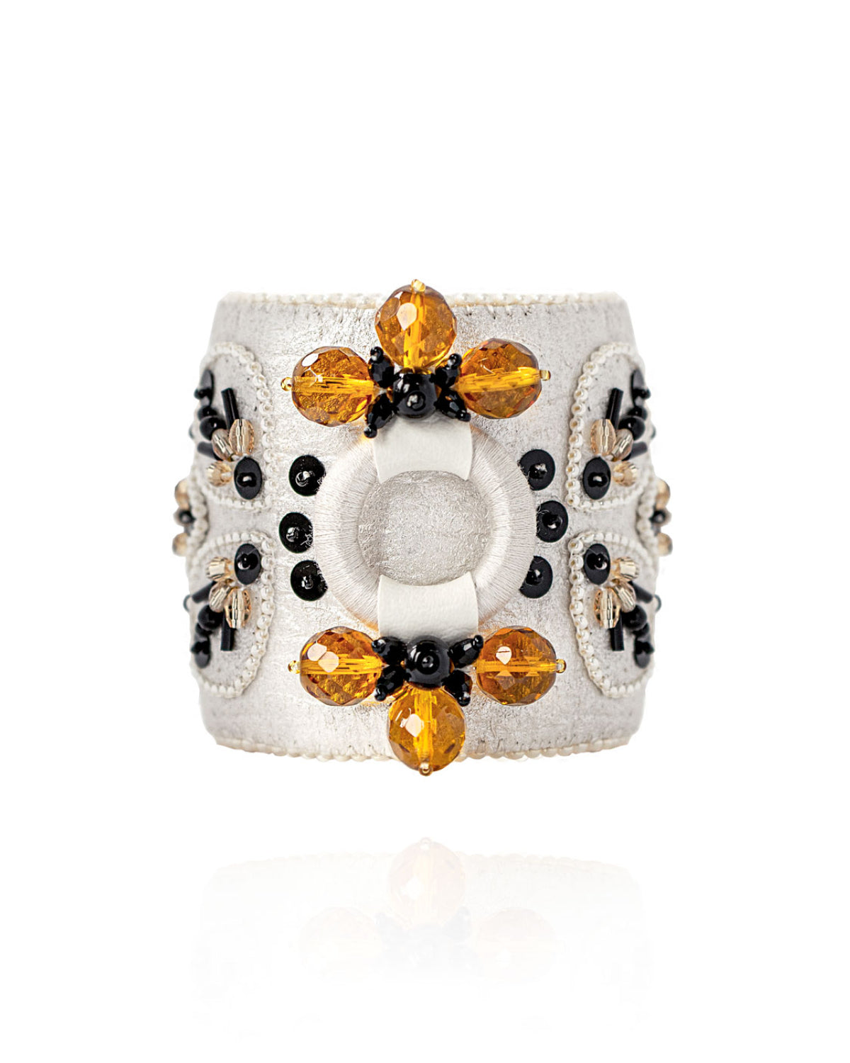 A fierce and unexpected statement accessory, Sienna Bracelets are oversized cuffs that shine a spotlight on your every move. Wrap your wrists in the glittering, hand-beaded symmetry of our signature kaleidoscopic designs. Then reach for a handshake or hug. Run a hand through your hair. Blow a kiss. There are endless chances to steal the show with Sienna Bracelets.