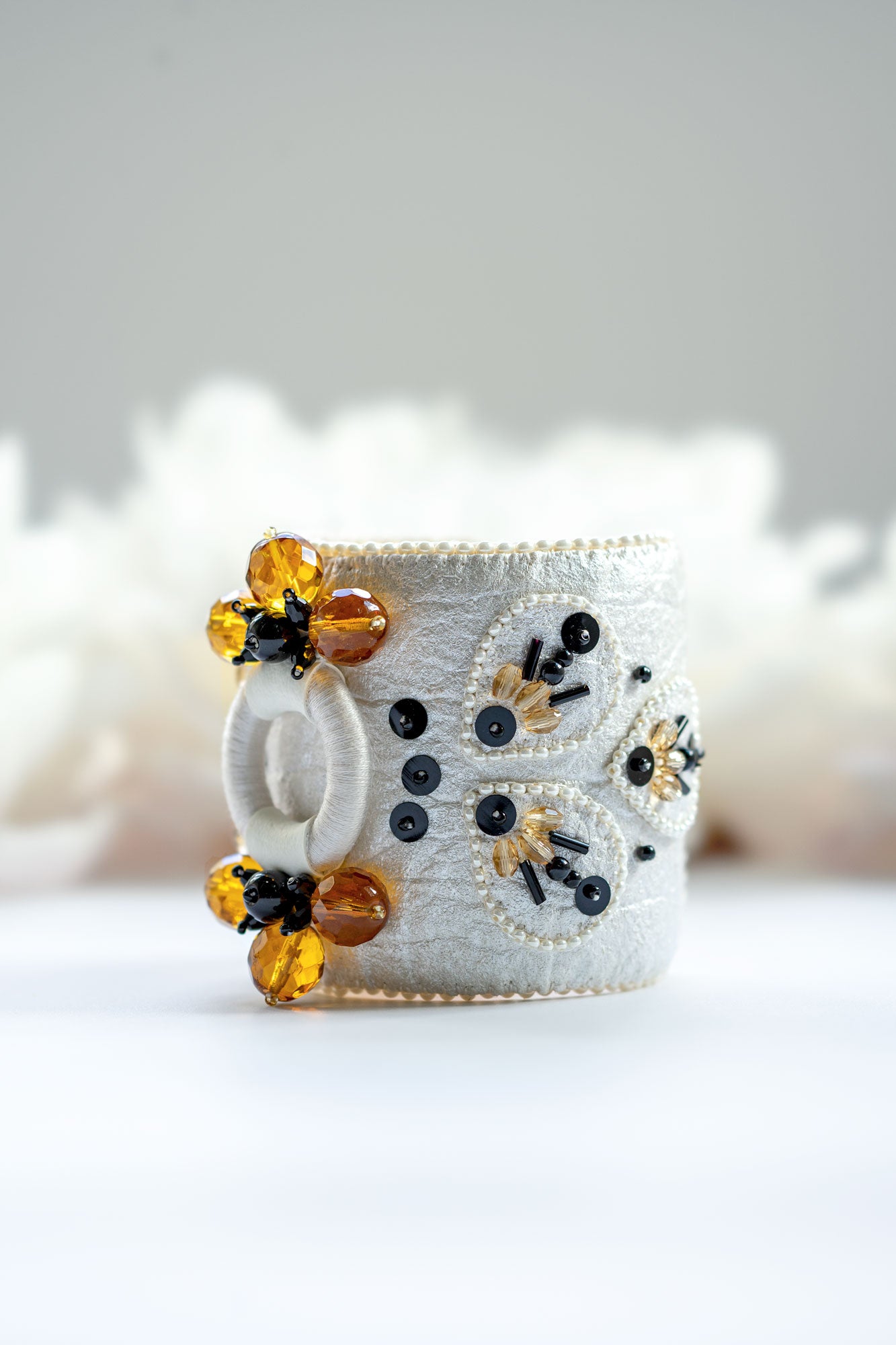 Pinatex® - Textile Made From Pineapple Leaves, Austrian Crystals, Czech Glass Beads, Upcycled Sequins & Beads, Glass Beads, Upcycled Vegan Leather, French Cotton Thread, Wood Base, Stainless Steel Base